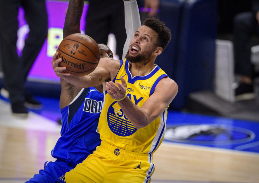 Feb 4, 2021; Dallas, Texas, USA; Golden State Warriors guard Stephen Curry (30) drives to the basket past Dallas Mavericks forward Dorian Finney-Smith (10) during the second half at the American Airlines Center. Mandatory Credit: Jerome Miron-USA TODAY Sports