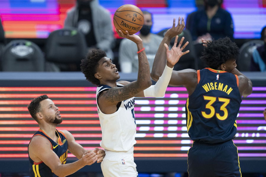January 25, 2021; San Francisco, California, USA; Minnesota Timberwolves forward Jaden McDaniels (3) shoots the basketball against Golden State Warriors guard Stephen Curry (30) and center James Wiseman (33) during the first quarter at Chase Center. Mandatory Credit: Kyle Terada-USA TODAY Sports