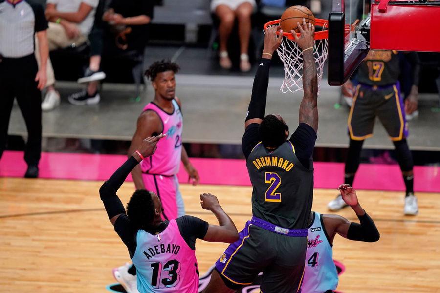 Apr 8, 2021; Miami, Florida, USA; Los Angeles Lakers center Andre Drummond (2) dunks the ball against the Miami Heat during the first half at American Airlines Arena. Mandatory Credit: Jasen Vinlove-USA TODAY Sports