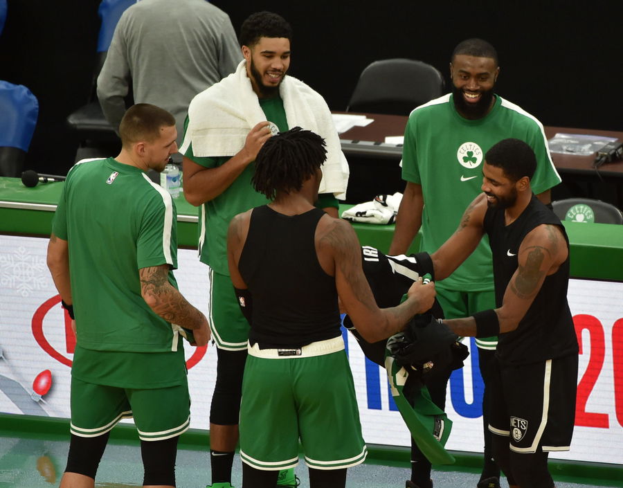 Dec 18, 2020; Boston, Massachusetts, USA; Boston Celtics center Robert Williams III (44) exchanges jerseys with Brooklyn Nets guard Kyrie Irving (11) at the end of the game at TD Garden. Mandatory Credit: Bob DeChiara-USA TODAY Sports