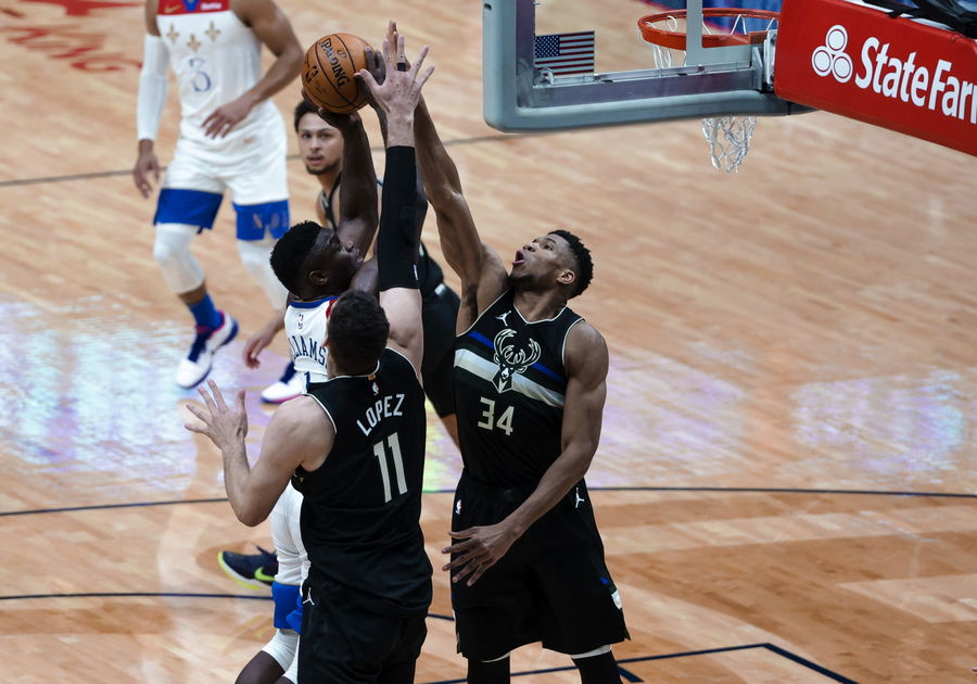 Jan 29, 2021; New Orleans, Louisiana, USA; New Orleans Pelicans forward Zion Williamson (1) has a shot blocked by Milwaukee Bucks forward Giannis Antetokounmpo (34) as center Brook Lopez (11) also defends during the second quarter at the Smoothie King Center. Mandatory Credit: Derick E. Hingle-USA TODAY Sports