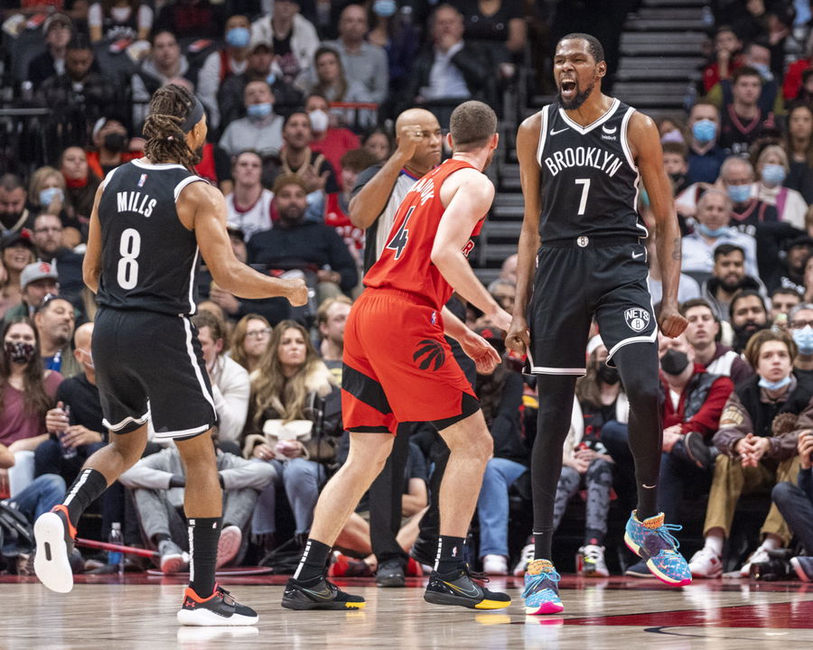 Nov 7, 2021; Toronto, Ontario, CAN; Brooklyn Nets forward Kevin Durant (7) celebrates after scoring against the Toronto Raptors during the second half at Scotiabank Arena. Mandatory Credit: Kevin Sousa-USA TODAY Sports