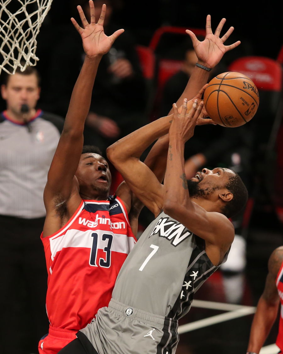 Jan 3, 2021; Brooklyn, New York, USA; Brooklyn Nets small forward Kevin Durant (7) is fouled as he shoots by Washington Wizards center Thomas Bryant (13) during the first quarter at Barclays Center. Mandatory Credit: Brad Penner-USA TODAY Sports