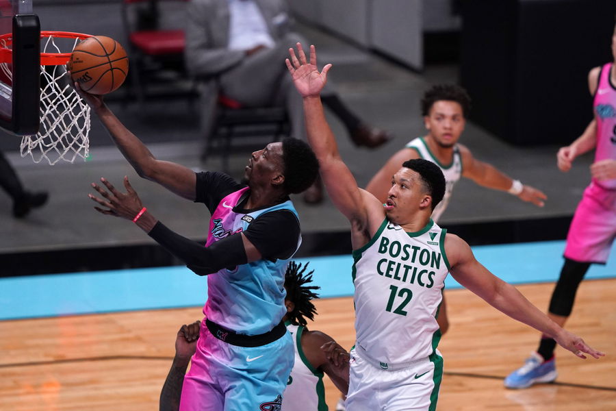 Jan 6, 2021; Miami, Florida, USA; Miami Heat center Bam Adebayo (13) shoots the ball in front of Boston Celtics forward Grant Williams (12) during the second half at American Airlines Arena. Mandatory Credit: Jasen Vinlove-USA TODAY Sports