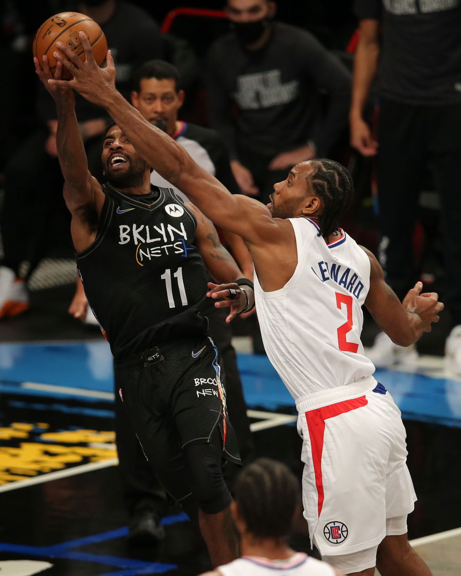 Feb 2, 2021; Brooklyn, New York, USA; Los Angeles Clippers small forward Kawhi Leonard (2) blocks a shot by Brooklyn Nets point guard Kyrie Irving (11) during the first quarter at Barclays Center. Mandatory Credit: Brad Penner-USA TODAY Sports