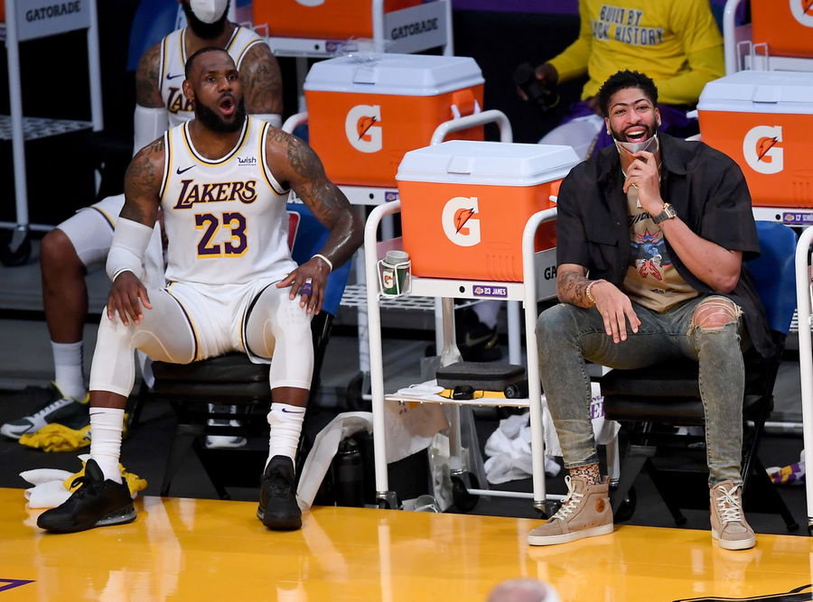 Feb 28, 2021; Los Angeles, California, USA; Los Angeles Lakers forward LeBron James (23) and forward Anthony Davis (3) react to a play while on the bench in the second half of the game against the Golden State Warriors at Staples Center. Mandatory Credit: Jayne Kamin-Oncea-USA TODAY Sports