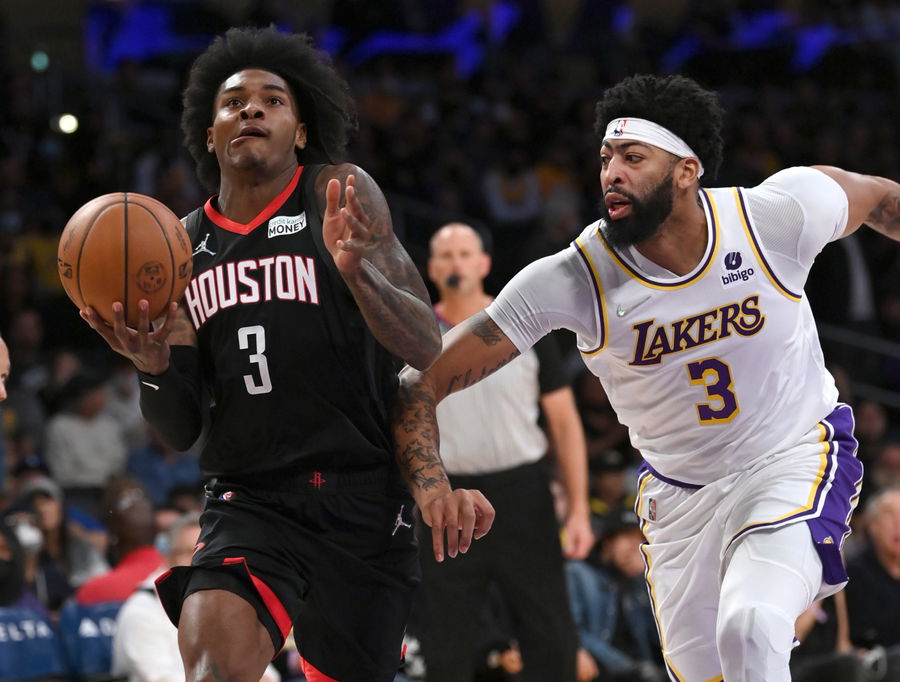 Oct 31, 2021; Los Angeles, California, USA; Houston Rockets guard Kevin Porter Jr. (3) drives to the basket past Los Angeles Lakers forward Anthony Davis (3) in the first half at Staples Center. Mandatory Credit: Jayne Kamin-Oncea-USA TODAY Sports