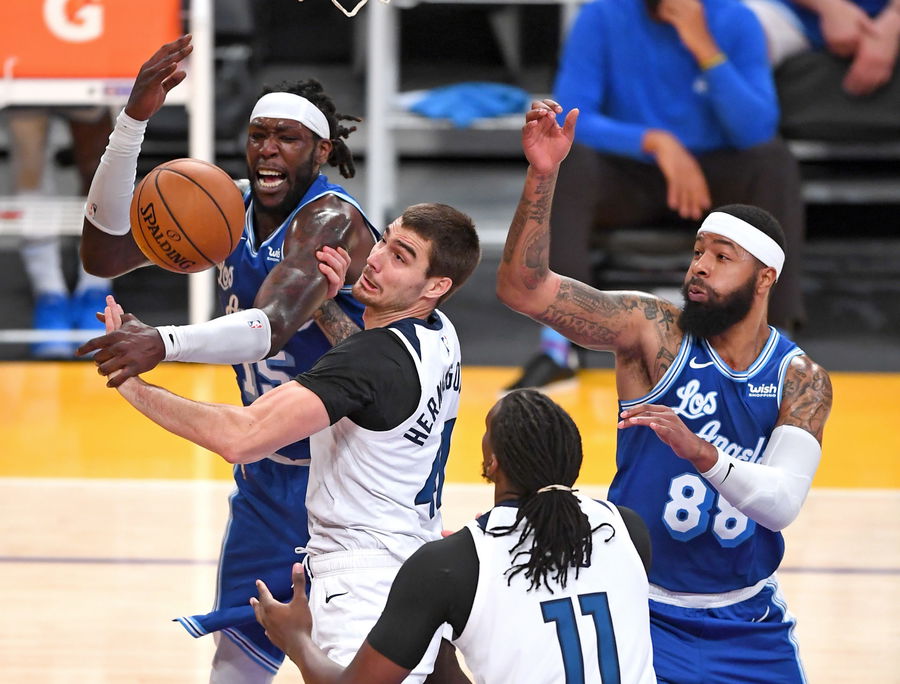 Dec 27, 2020; Los Angeles, California, USA; Los Angeles Lakers forward Montrezl Harrell (15), Minnesota Timberwolves forward Juancho Hernangomez (41) and Los Angeles Lakers forward Markieff Morris (88) battle for a rebound in the first half of the game at Staples Center. Mandatory Credit: Jayne Kamin-Oncea-USA TODAY Sports