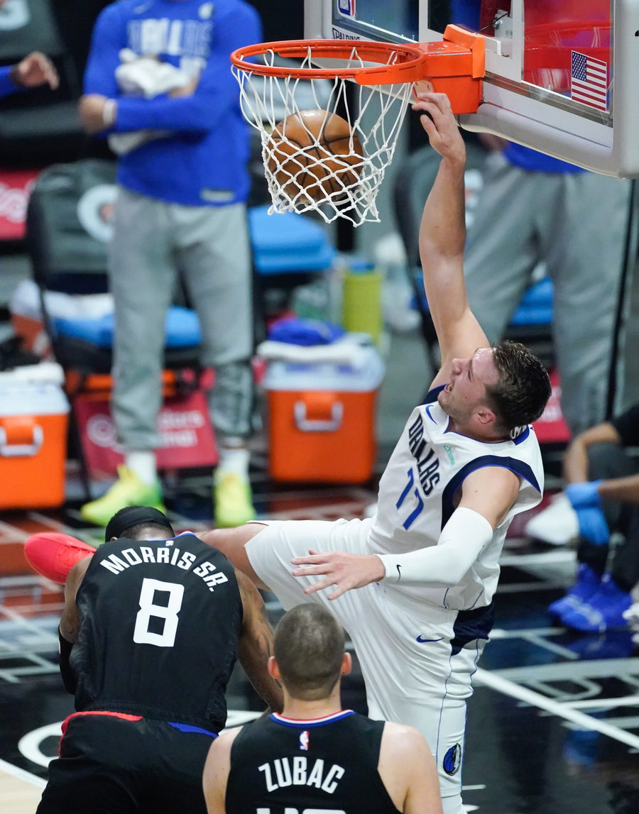 May 25, 2021; Los Angeles, California, USA; Dallas Mavericks guard Luka Doncic (77) slam dunks over LA Clippers forward Marcus Morris Sr. (8) and center Ivica Zubac (40) in the first quarter of game two in the first round of the 2021 NBA Playoffs. at Staples Center. Mandatory Credit: Robert Hanashiro-USA TODAY Sports