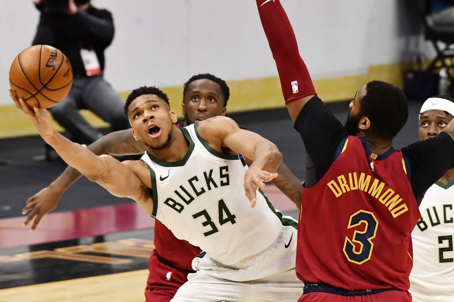 Feb 5, 2021; Cleveland, Ohio, USA; Milwaukee Bucks forward Giannis Antetokounmpo (34) drives to the basket against Cleveland Cavaliers center Andre Drummond (3) during the fourth quarter at Rocket Mortgage FieldHouse. Mandatory Credit: Ken Blaze-USA TODAY Sports