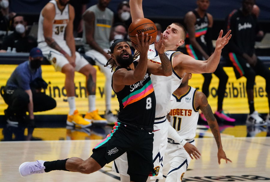 Apr 7, 2021; Denver, Colorado, USA; San Antonio Spurs guard Patty Mills (8) shoots the ball past Denver Nuggets center Nikola Jokic (15) in the first quarter at Ball Arena. Mandatory Credit: Ron Chenoy-USA TODAY Sports