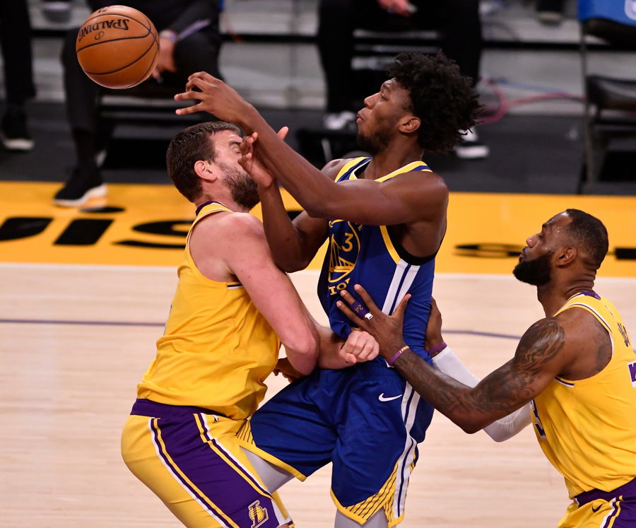 Jan 18, 2021; Los Angeles, California, USA; Golden State Warriors center James Wiseman (33) runs into Los Angeles Lakers center Marc Gasol (14) during the third quarter at Staples Center. Mandatory Credit: Robert Hanashiro-USA TODAY Sports
