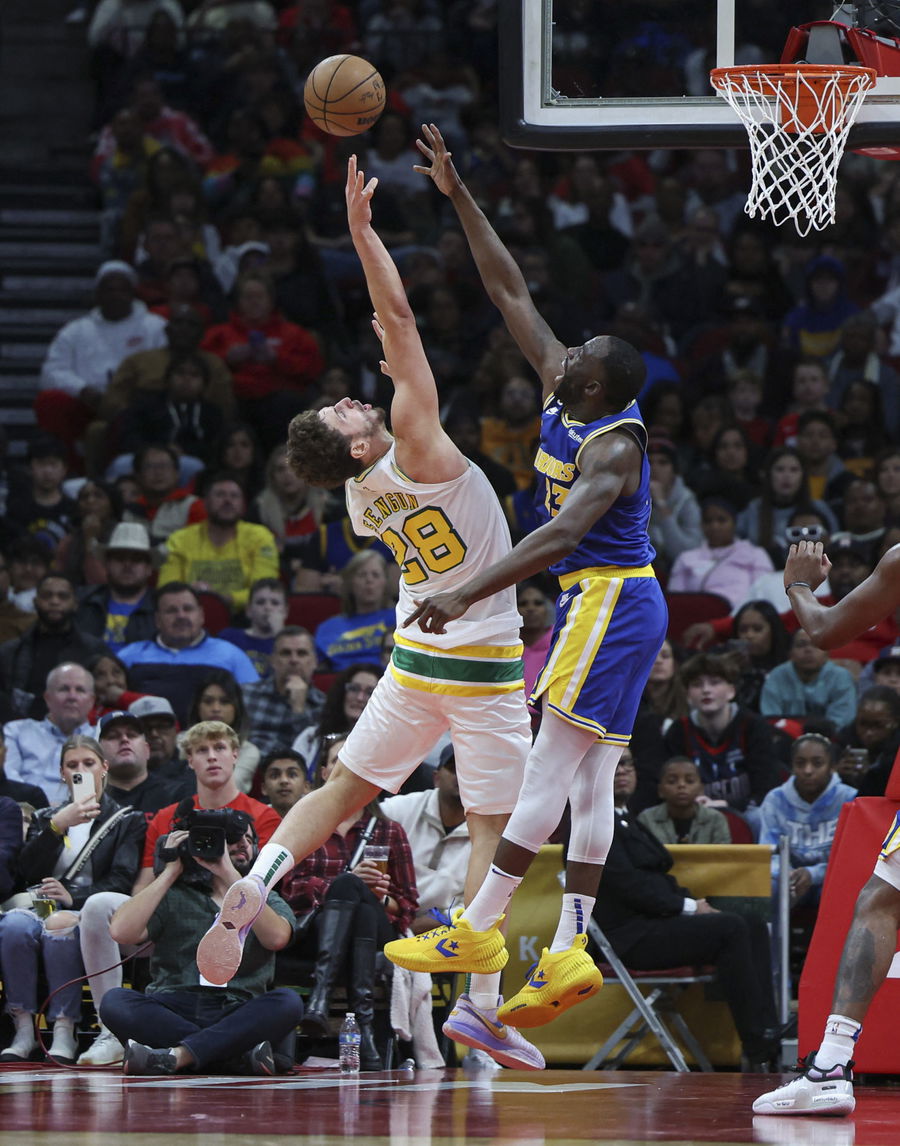 Nov 20, 2022; Houston, Texas, USA; Golden State Warriors forward Draymond Green (23) defends against Houston Rockets center Alperen Sengun (28) during the third quarter at Toyota Center. Mandatory Credit: Troy Taormina-USA TODAY Sports