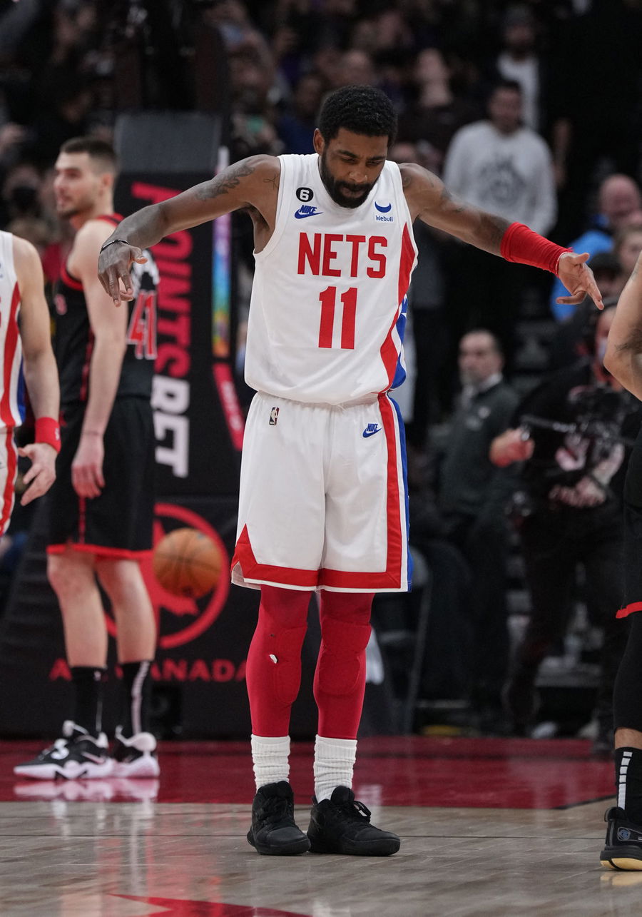 Dec 16, 2022; Toronto, Ontario, CAN; Brooklyn Nets guard Kyrie Irving (11) celebrates after shooting the winning basket against the Toronto Raptors during the fourth quarter at the Scotiabank Arena. Mandatory Credit: Nick Turchiaro-USA TODAY Sports