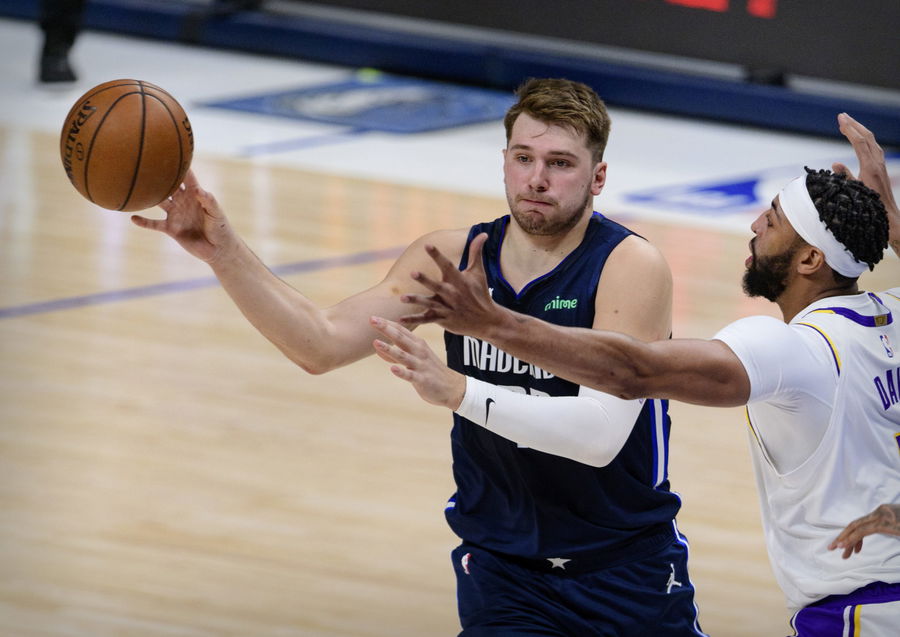 Mavericks’ Luka Doncic passes the ball against the Lakers’ Anthony Davis at the American Airlines Center. Mandatory Credit: Jerome Miron-USA TODAY Sports