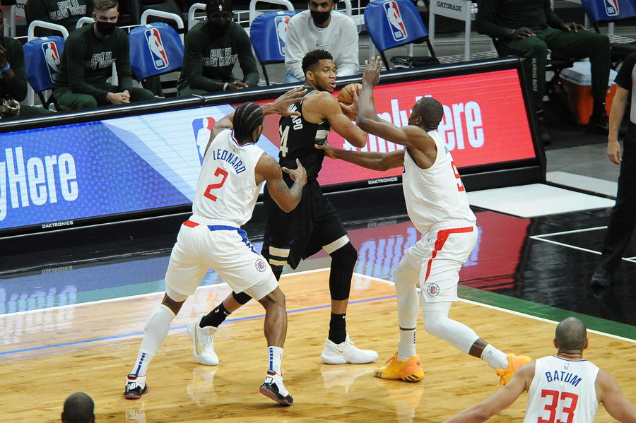 Feb 28, 2021; Milwaukee, Wisconsin, USA; Milwaukee Bucks forward Giannis Antetokounmpo (34) is defended by LA Clippers forward Kawhi Leonard (2) and center Serge Ibaka (9) in the first quarter at Fiserv Forum. Mandatory Credit: Michael McLoone-USA TODAY Sports
