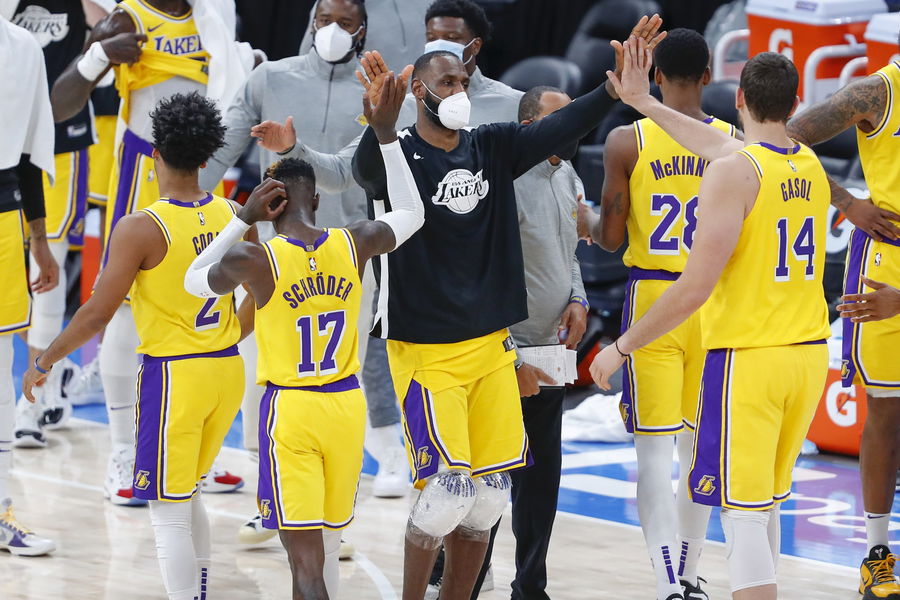 Jan 13, 2021; Oklahoma City, Oklahoma, USA; Los Angeles Lakers forward LeBron James (23) high fives guard Dennis Schroder (17) and center Marc Gasol (14) during a time out against the Oklahoma City Thunder in the second half at Chesapeake Energy Arena. Mandatory Credit: Alonzo Adams-USA TODAY Sports