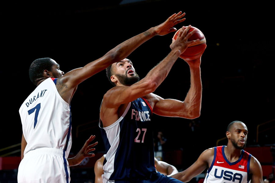 Tokyo 2020 Olympics – Basketball – Men – Gold medal match – France v United States – Saitama Super Arena, Saitama, Japan – August 7, 2021. Rudy Gobert of France in action with Kevin Durant of the United States REUTERS/Sergio Perez
