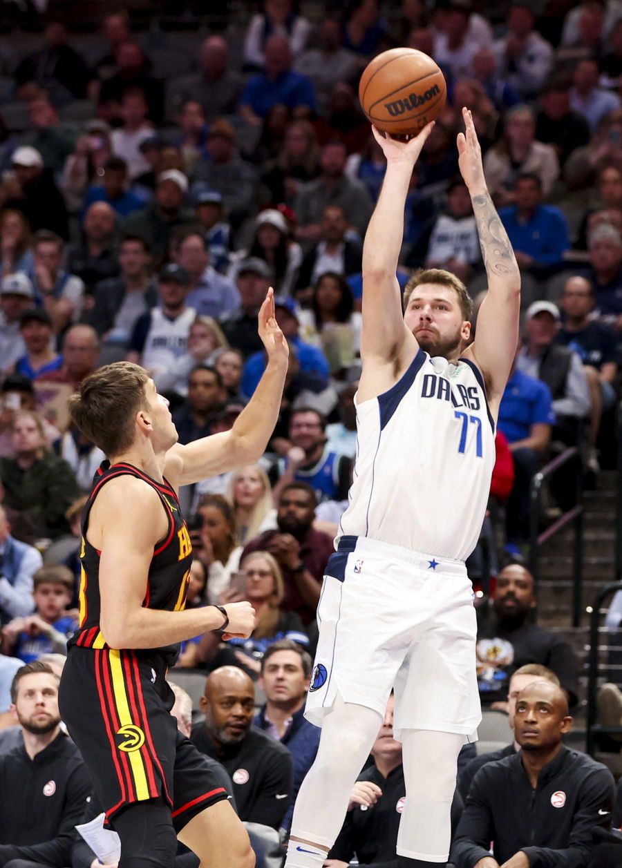 Jan 18, 2023; Dallas, Texas, USA; Dallas Mavericks guard Luka Doncic (77) shoots over Atlanta Hawks guard Bogdan Bogdanovic (13) during the second half at American Airlines Center. Mandatory Credit: Kevin Jairaj-USA TODAY Sports