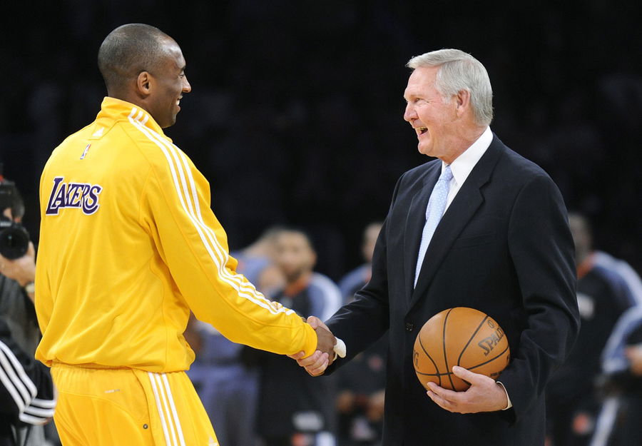 Lakers Kobe Bryant shakes hands with Jerry West during a ceremony at half court to honor Kobe’s record for most points by a Laker at the Staples Center Wednesday. (Photo by Wally Skalij/Los Angeles Times via Getty Images)