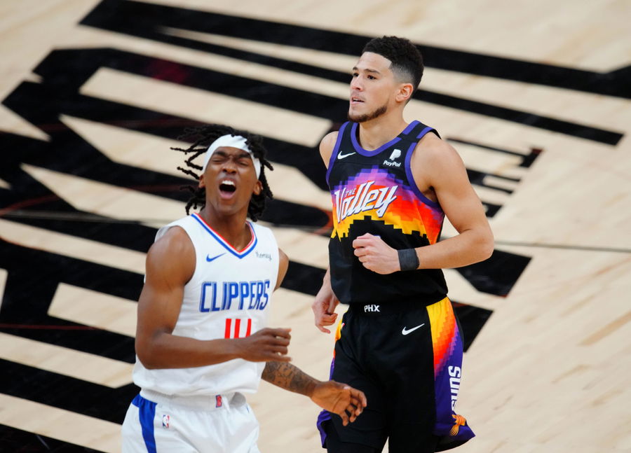 Jun 20, 2021; Phoenix, Arizona, USA; Phoenix Suns guard Devin Booker (1) next to Los Angeles Clippers guard Terance Mann (14) during game one of the Western Conference Finals for the 2021 NBA Playoffs at Phoenix Suns Arena. Mandatory Credit: Mark J. Rebilas-USA TODAY Sports
