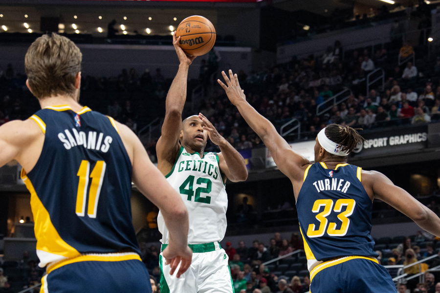 Jan 12, 2022; Indianapolis, Indiana, USA; Boston Celtics center Al Horford (42) shoots the ball while Indiana Pacers center Myles Turner (33) in the second half at Gainbridge Fieldhouse. Mandatory Credit: Trevor Ruszkowski-USA TODAY Sports