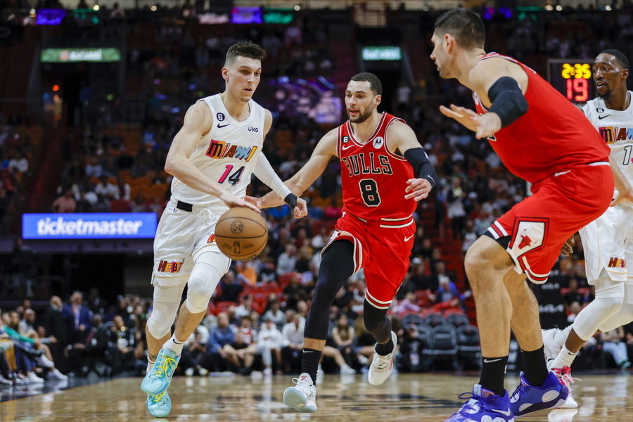 Dec 20, 2022; Miami, Florida, USA; Miami Heat guard Tyler Herro (14) dribbles the basketball ahead of Chicago Bulls guard Zach LaVine (8) during the fourth quarter at FTX Arena. Mandatory Credit: Sam Navarro-USA TODAY Sports