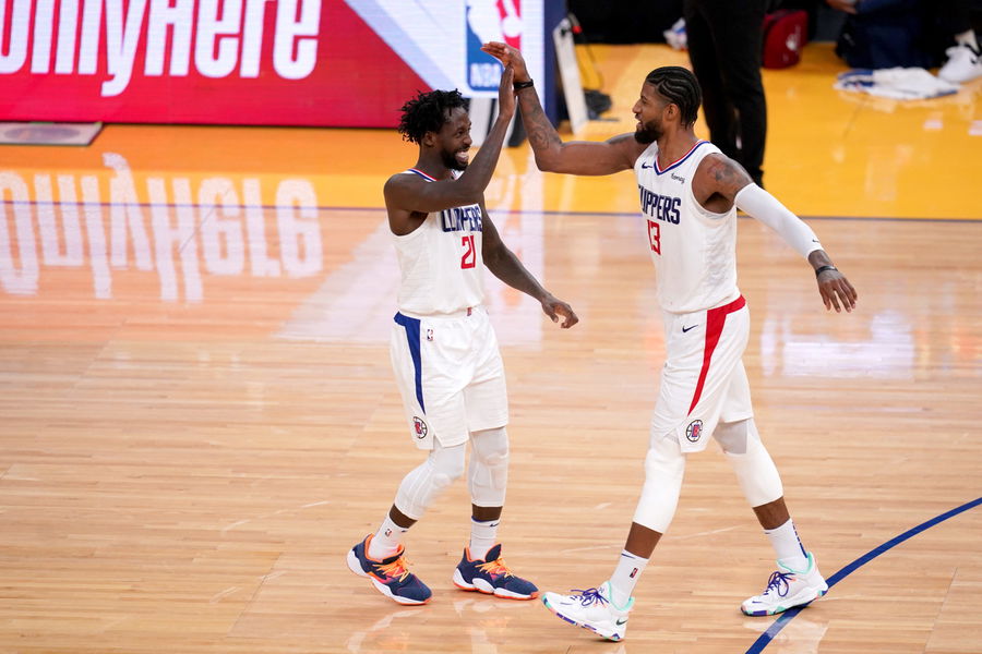 Jan 6, 2021; San Francisco, California, USA; Los Angeles Clippers guard Patrick Beverley (21) and forward Paul George (13) react after the Golden State Warriors were called for a foul in the fourth quarter at the Chase Center. Mandatory Credit: Cary Edmondson-USA TODAY Sports