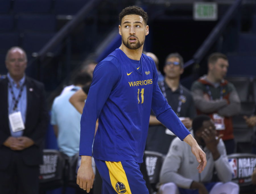 Klay Thompson participates in a Golden State Warriors practice at Oracle Arena in Oakland, Calif. on Wednesday, June 12, 2019 before Thursday’s Game 6 of the NBA Finals against the Toronto Raptors. (Photo by Paul Chinn/San Francisco Chronicle via Getty Images)