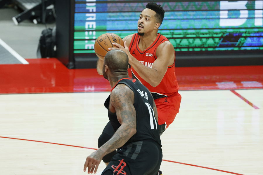 Dec 26, 2020; Portland, Oregon, USA; Portland Trail Blazers shooting guard CJ McCollum (3) attempts to shoot as Houston Rockets power forward P.J. Tucker (17) defends during the first half at Moda Center. Mandatory Credit: Soobum Im-USA TODAY Sports