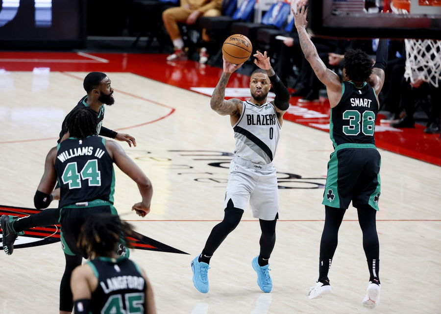 Apr 13, 2021; Portland, Oregon, USA; Portland Trail Blazers point guard Damian Lillard (0) passes the ball against Boston Celtics point guard Marcus Smart (36) during the first half at Moda Center. Mandatory Credit: Soobum Im-USA TODAY Sports