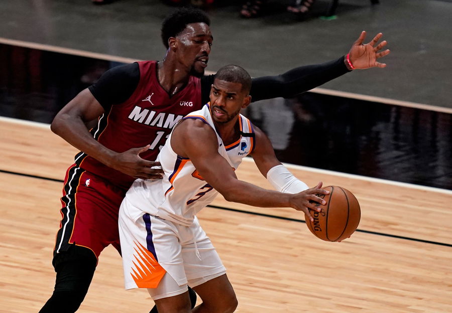 Mar 23, 2021; Miami, Florida, USA; Phoenix Suns guard Chris Paul (3) controls the ball around Miami Heat center Bam Adebayo (13) during the first half at American Airlines Arena. Mandatory Credit: Jasen Vinlove-USA TODAY Sports