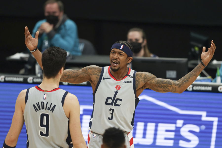 Feb 7, 2021; Charlotte, North Carolina, USA; Washington Wizards guard Bradley Beal (3) yells at forward Deni Avdija (9) as they play against the Charlotte Hornets in the first half at Spectrum Center. Mandatory Credit: Nell Redmond-USA TODAY Sports