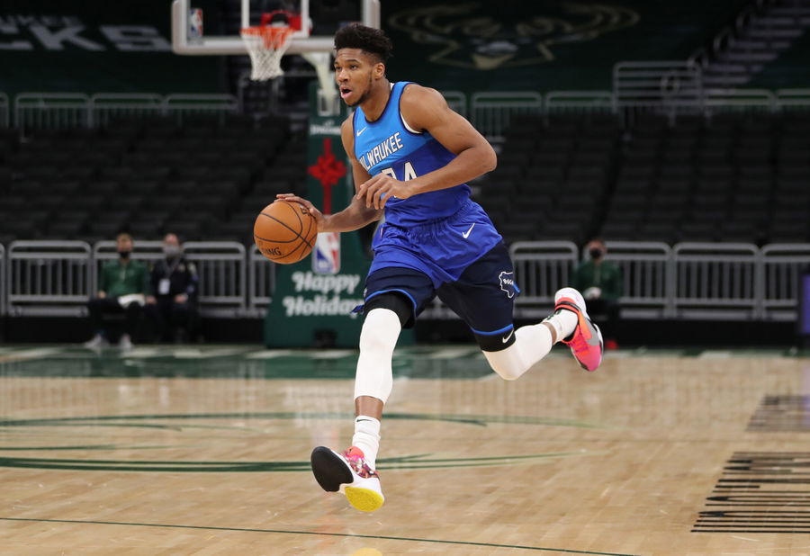 Dec 25, 2020; Milwaukee, WI, USA; Milwaukee Bucks forward Giannis Antetokounmpo (34) brings the ball up court against the Golden State Warriors during a NBA game at the Bradley Center. Mandatory Credit: Nick Monroe/Handout Photo-USA TODAY Sports