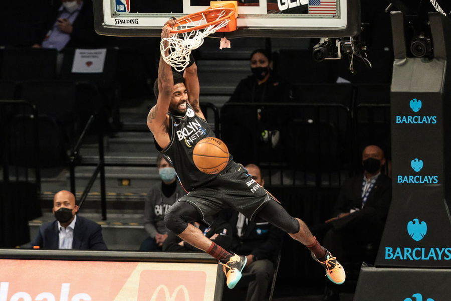 Apr 5, 2021; Brooklyn, New York, USA; Brooklyn Nets guard Kyrie Irving (11) dunks the ball against the New York Knicks during the second half at Barclays Center. Mandatory Credit: Vincent Carchietta-USA TODAY Sports