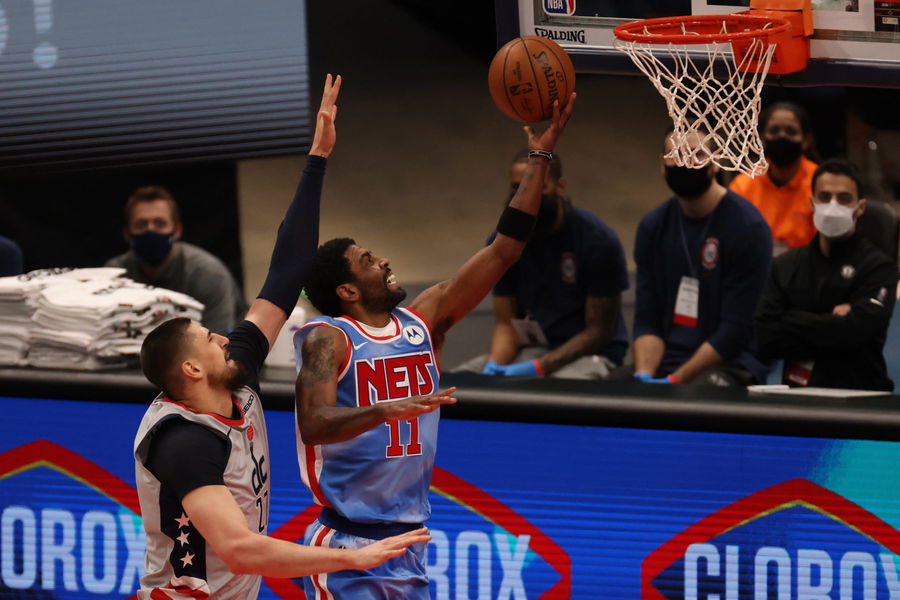 Jan 31, 2021; Washington, District of Columbia, USA; Brooklyn Nets guard Kyrie Irving (11) shoots the ball as Washington Wizards center Alex Len (27) defends in the first quarter at Capital One Arena. Mandatory Credit: Geoff Burke-USA TODAY Sports
