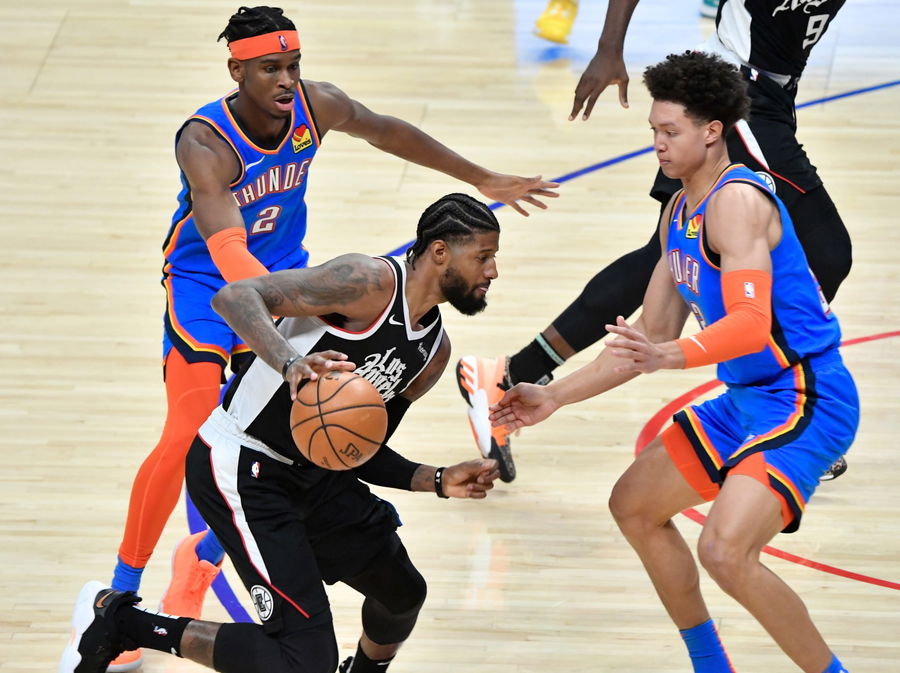 Jan 24, 2021; Los Angeles, California, USA; LA Clippers guard Paul George (13) moves the ball past Oklahoma City Thunder forward Isaiah Roby (22) and Oklahoma City Thunder guard Shai Gilgeous-Alexander (2) during the third quarter at Staples Center. Mandatory Credit: Robert Hanashiro-USA TODAY Sports