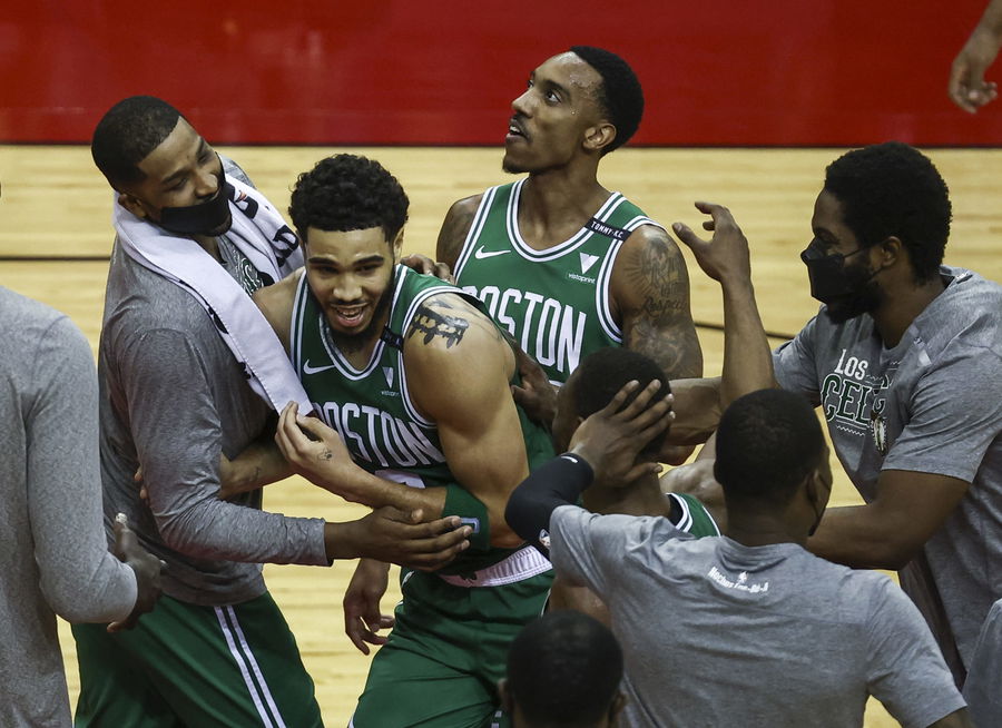 Mar 14, 2021; Houston, Texas, USA; Boston Celtics forward Jayson Tatum (0) celebrates with teammates after the end of the third quarter against the Houston Rockets at Toyota Center. Mandatory Credit: Troy Taormina-USA TODAY Sports