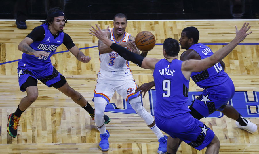 Jan 2, 2021; Orlando, Florida, USA; Oklahoma City Thunder guard George Hill (3) loses the ball against Orlando Magic center Nikola Vucevic (9) and guard Markelle Fultz (20) and forward Gary Clark (12) during the second quarter at Amway Center. Mandatory Credit: Reinhold Matay-USA TODAY Sports