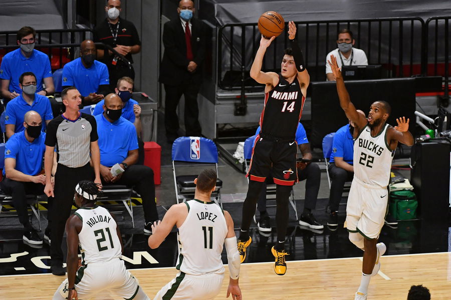 Dec 29, 2020; Miami, Florida, USA; Miami Heat guard Tyler Herro (14) attempts a three point shot against the Milwaukee Bucks during the first half at American Airlines Arena. Mandatory Credit: Jasen Vinlove-USA TODAY Sports