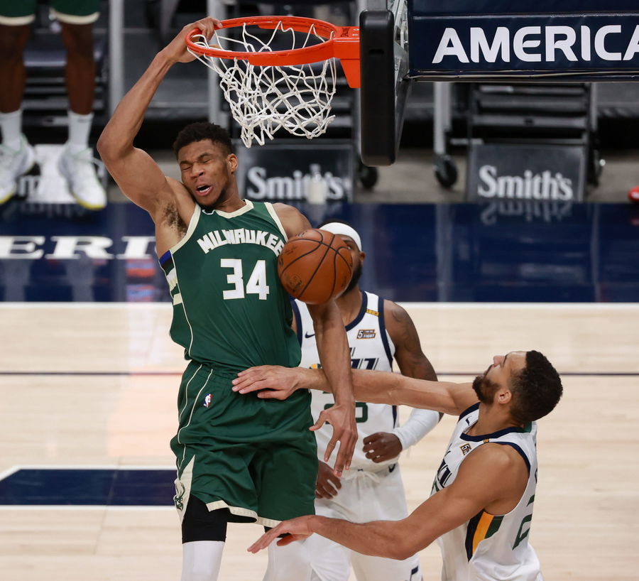 Feb 12, 2021; Salt Lake City, Utah, USA; Milwaukee Bucks forward Giannis Antetokounmpo (34) dunks the ball over Utah Jazz center Rudy Gobert (27) during the fourth quarter at Vivint Smart Home Arena. Utah Jazz win 129-115. Mandatory Credit: Chris Nicoll-USA TODAY Sports