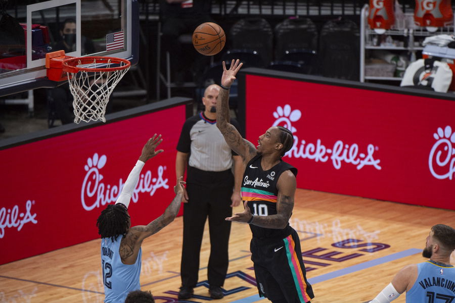 Dec 23, 2020; Memphis, Tennessee, USA; San Antonio Spurs guard DeMar DeRozan (10) shoots against Memphis Grizzlies guard Ja Morant (12) during the second half at FedExForum. Mandatory Credit: Justin Ford-USA TODAY Sports