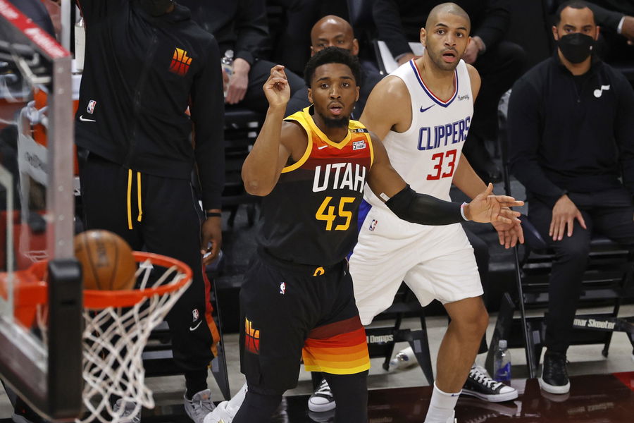 Jun 8, 2021; Salt Lake City, Utah, USA; Utah Jazz guard Donovan Mitchell (45) watches is three-pointer drop against LA Clippers forward Nicolas Batum (33) in the first quarter during game one in the second round of the 2021 NBA Playoffs. at Vivint Arena. Mandatory Credit: Jeffrey Swinger-USA TODAY Sports