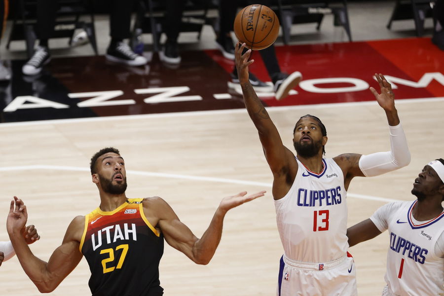 Jun 8, 2021; Salt Lake City, Utah, USA; Utah Jazz center Rudy Gobert (27) and LA Clippers guard Paul George (13) battle in the first quarter during game one in the second round of the 2021 NBA Playoffs. at Vivint Arena. Mandatory Credit: Jeffrey Swinger-USA TODAY Sports | Courtesy: Reuters