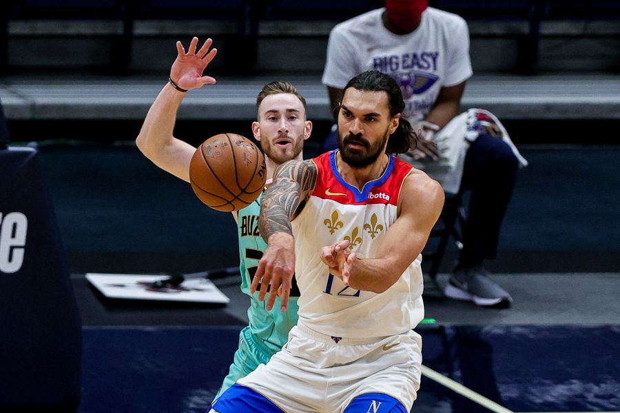 Jan 8, 2021; New Orleans, Louisiana, USA; New Orleans Pelicans center Steven Adams (12) passes the ball in front of Charlotte Hornets forward Gordon Hayward (20) during the fist quarter at Smoothie King Center. Mandatory Credit: Stephen Lew-USA TODAY Sports