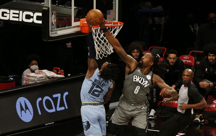 Dec 28, 2020; Brooklyn, New York, USA; Brooklyn Nets center DeAndre Jordan (6) blocks a shot by Memphis Grizzlies guard Ja Morant (12) during the first half at Barclays Center. Mandatory Credit: Andy Marlin-USA TODAY Sports
