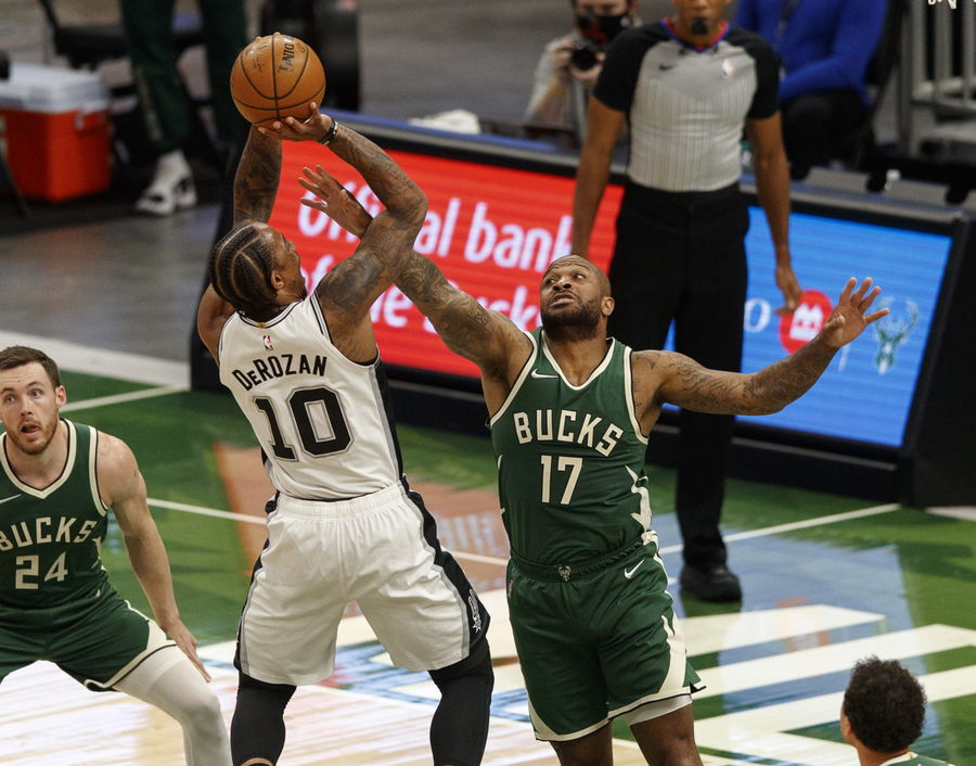 Mar 20, 2021; Milwaukee, Wisconsin, USA; Milwaukee Bucks forward P. J. Tucker (17) defends San Antonio Spurs guard DeMar DeRozan (10) during the first quarter at Fiserv Forum. Mandatory Credit: Jeff Hanisch-USA TODAY Sports