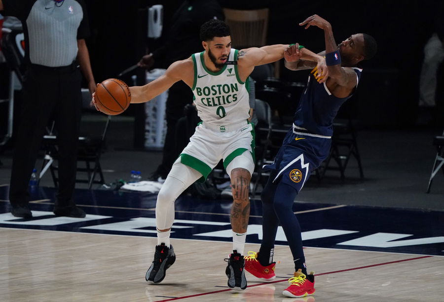 Apr 11, 2021; Denver, Colorado, USA;Boston Celtics forward Jayson Tatum (0) collides into Denver Nuggets forward Will Barton (5) in the fourth quarter at Ball Arena. Mandatory Credit: Ron Chenoy-USA TODAY Sports