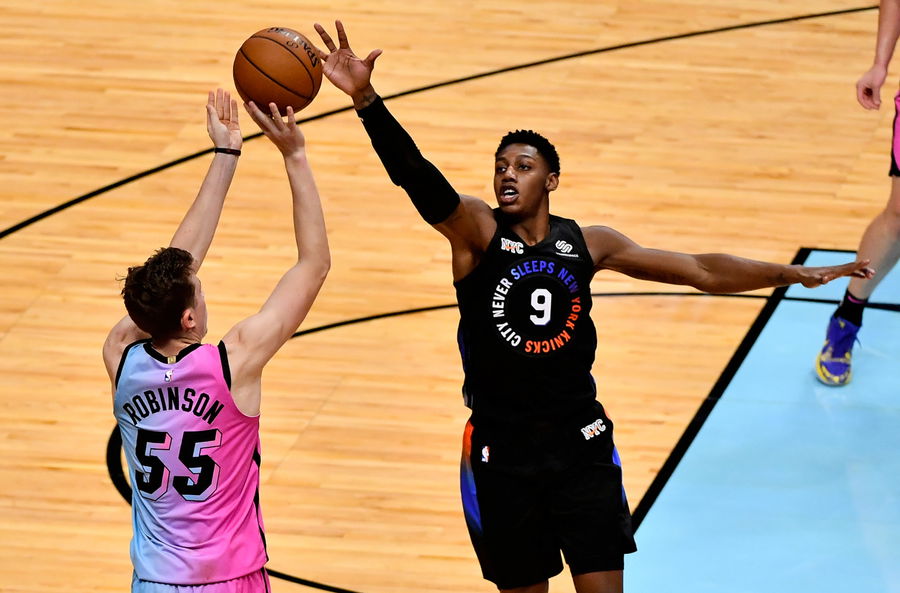 Feb 9, 2021; Miami, Florida, USA; Miami Heat guard Duncan Robinson (55) attempts a three point shot over New York Knicks guard RJ Barrett (9) during the second half at American Airlines Arena. Mandatory Credit: Jasen Vinlove-USA TODAY Sports