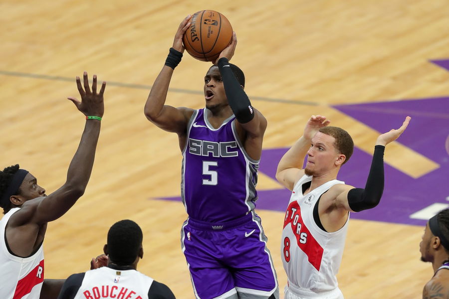Jan 8, 2021; Sacramento, California, USA; Sacramento Kings guard De’Aaron Fox (5) drives to the basket past Toronto Raptors guard Malachi Flynn (8) during the third quarter at Golden 1 Center. Mandatory Credit: Sergio Estrada-USA TODAY Sports